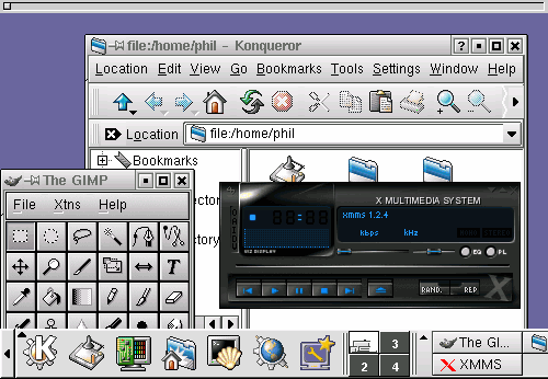 Cluttered desktop? No problem! KDE2 has a "show/hide desktop" button in the kicker.